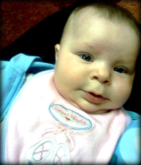 Chloe's stats: On Friday Chloe had her 4 month checkup with her pediatrician. She now weighs 18.5 lbs and is 26 3/4 inches long. This puts Chloe above the 95 % for both weight and height! Since my daughter has been born she has gained a total of 9 lbs and has grown exactly 5 inches. It makes me feel so proud that she is healthy and thriving on just breast milk alone!